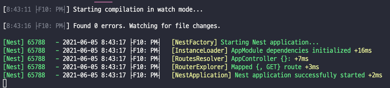 당연하지만 우리의 코드에 에러가 없다는 메시지와 서버가 시작되었습니다.